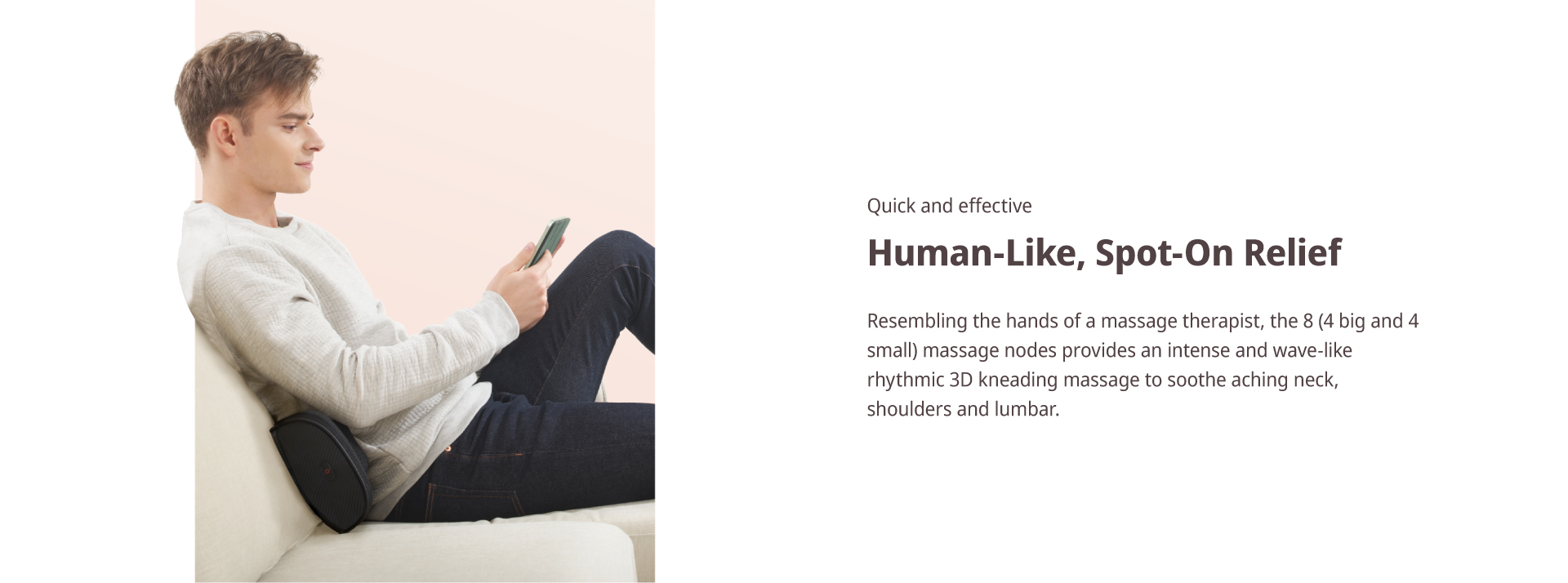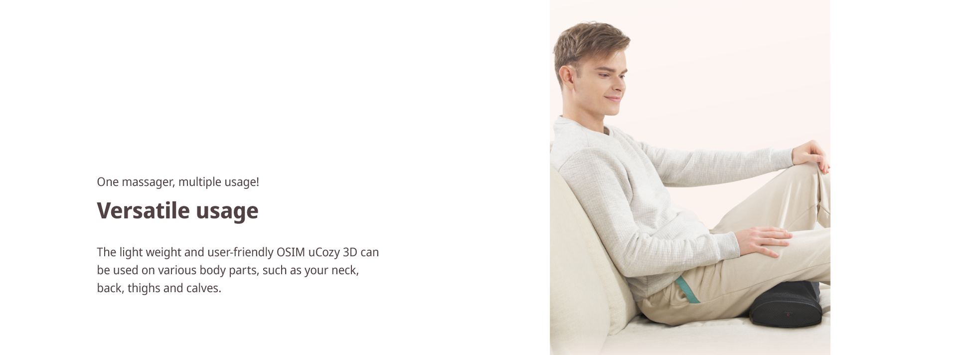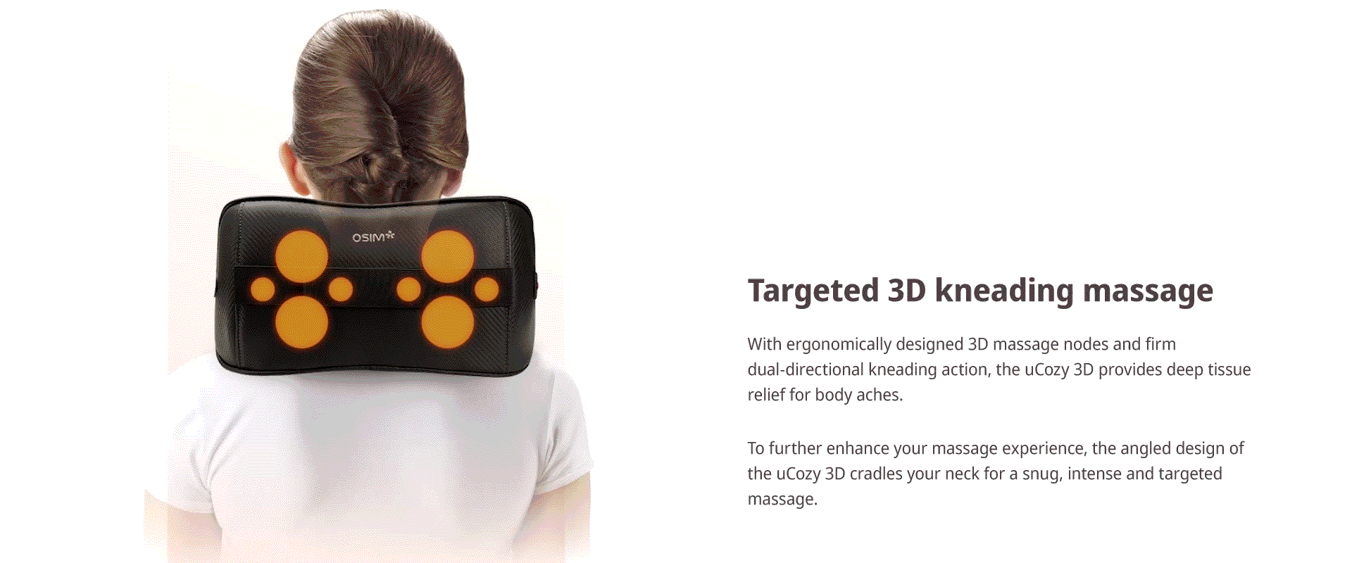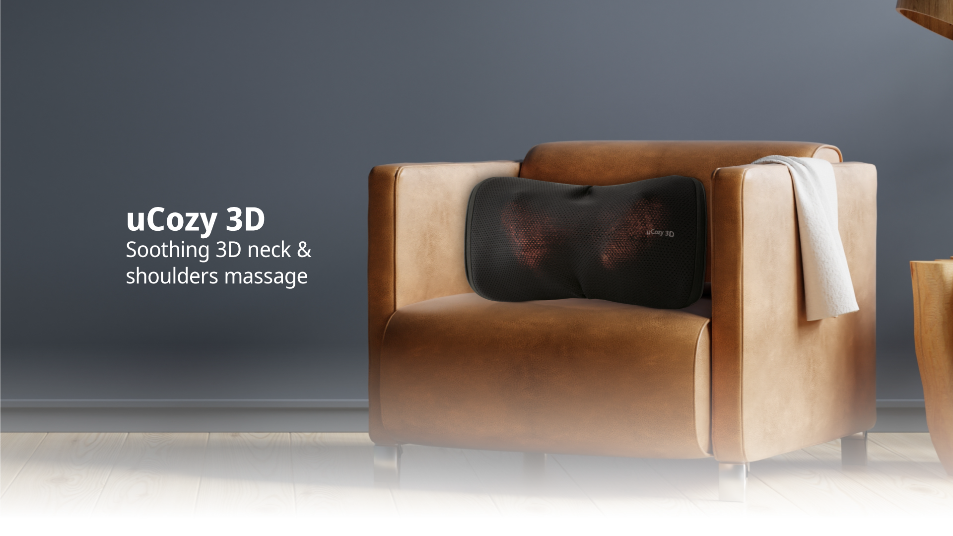 Targeted 3D kneading massage With ergonomically designed 3D massage nodes and firm dual-directional kneading action, the uCozy 3D provides deep tissue relief for body aches. To further enhance your massage experience, the angled design of the uCozy 3D cradles your neck for a snug, intense and targeted massage. Use anywhere, anytime The portable uCozy 3D neck and shoulders massager can be used in the comfort of your home, on your office chair or even in the car (with the car adapter).