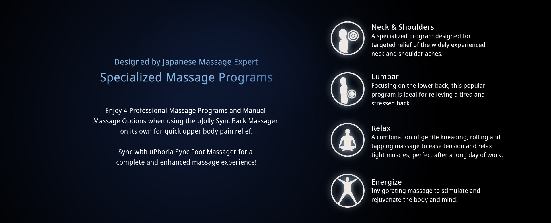 Melt away tension in your neck, shoulders, upper and lower back with the OSIM uJolly Sync, an innovative upper body massager from the portable OSIM Invisible Massage Chair. Featuring OSIM’s signature V-Grip massage and Ashiatsu-inspired back-stepping massage technique, the uJolly Sync grips, kneads, taps, rolls and glides along your entire back to deliver deep relaxation and targeted muscle relief.