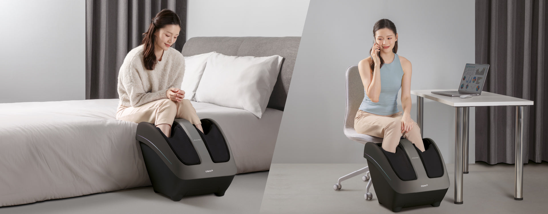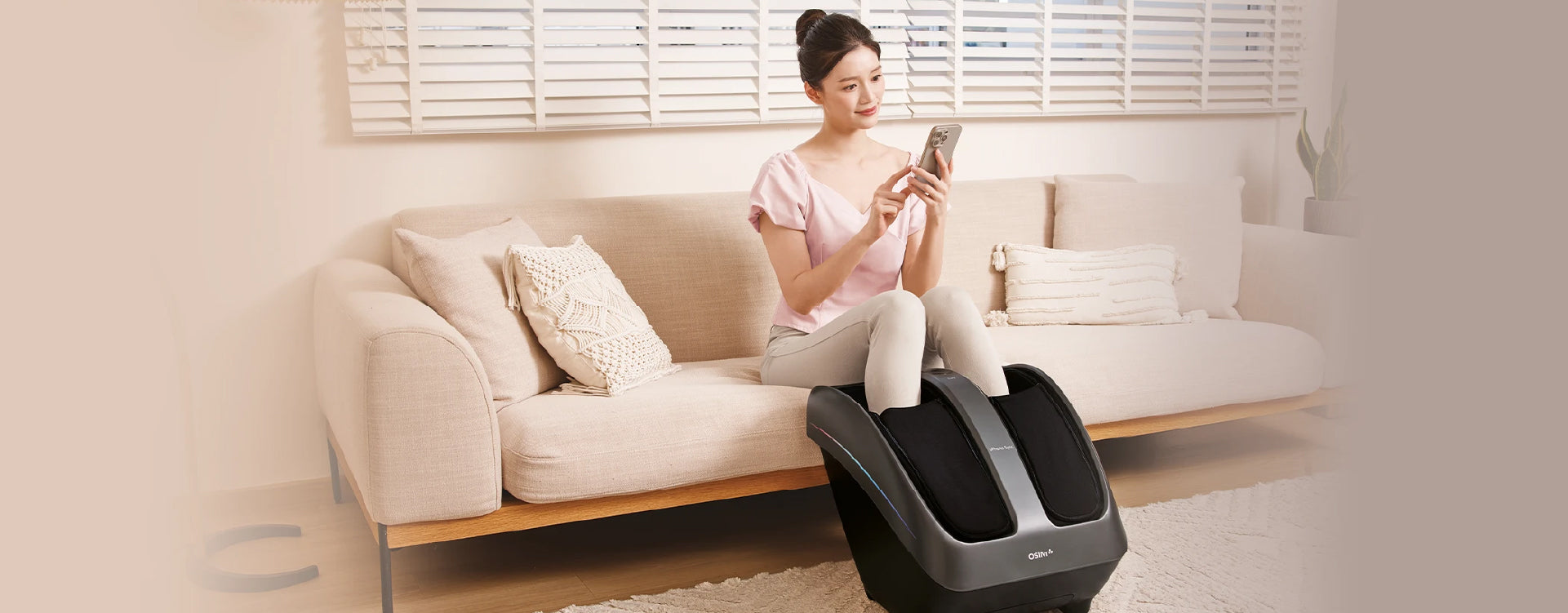 Experience complete leg wellness with the uPhoria Sync Calves & Foot massager, part of the innovative OSIM Invisible Massage Chair. Engineered with CalfGlide™ Tui-Na massage, wrap around squeeze-and-knead massage, vibration massage, foot reflexology, and soothing warmth, the uPhoria Syncs targets key meridian points along the legs to enhance circulation, promote well-being and deliver optimal comfort and rejuvenation for tired legs.