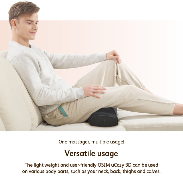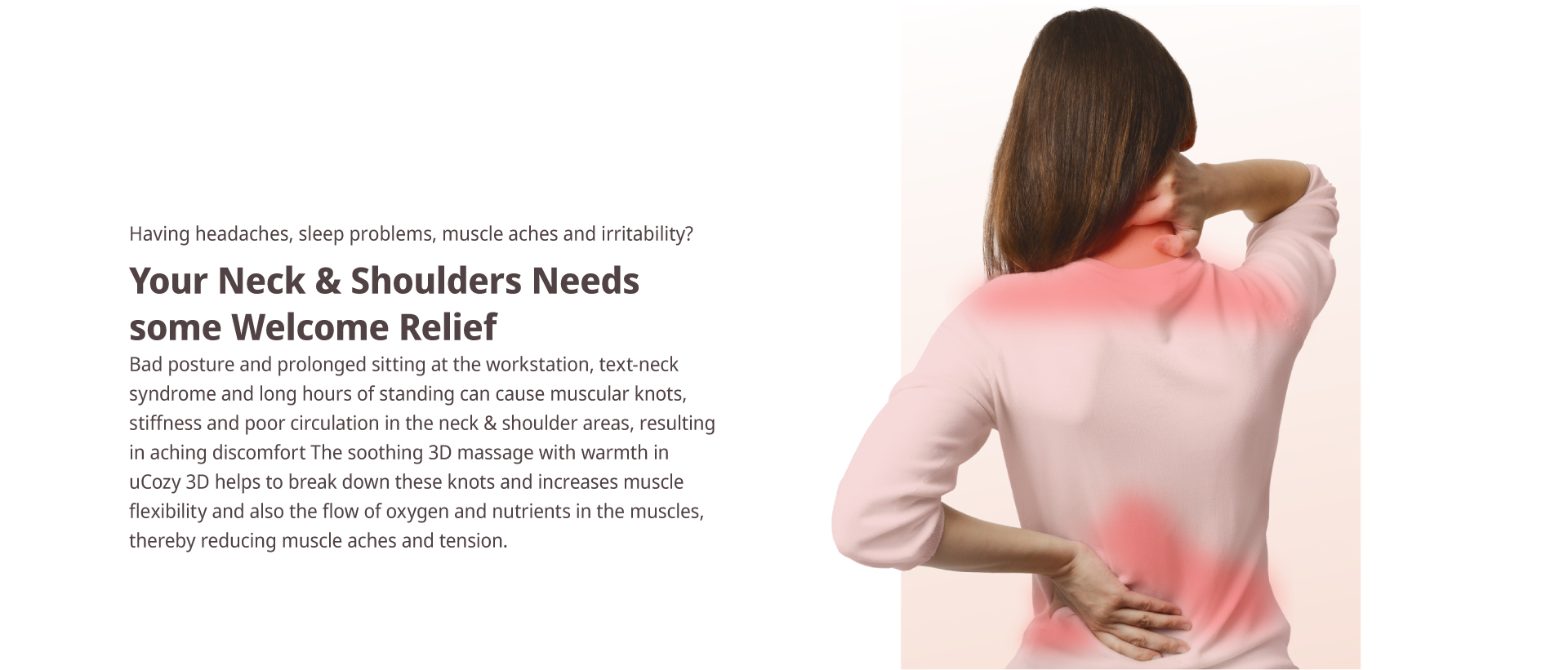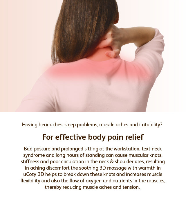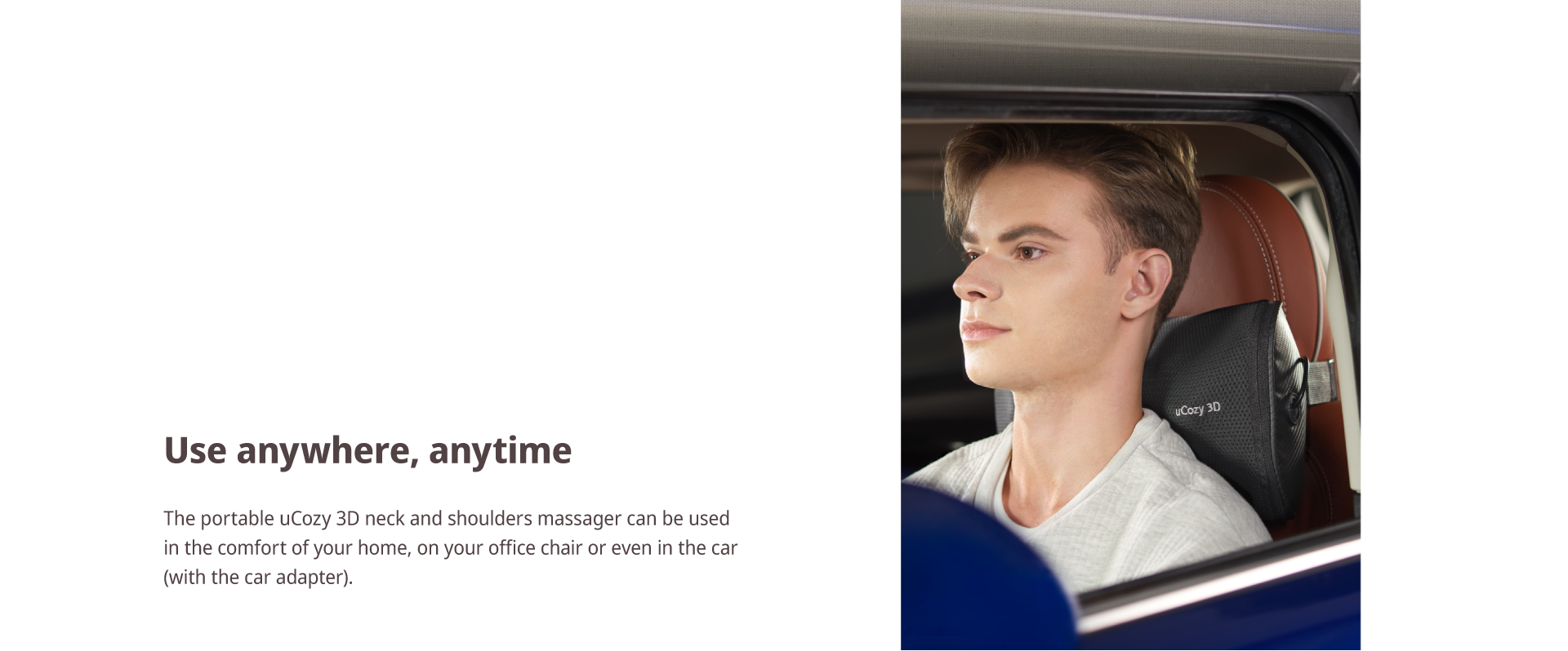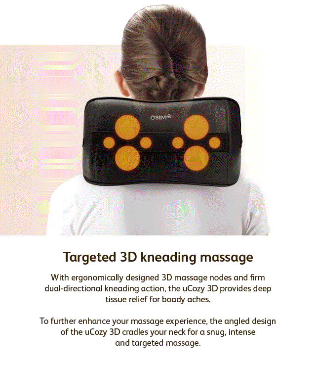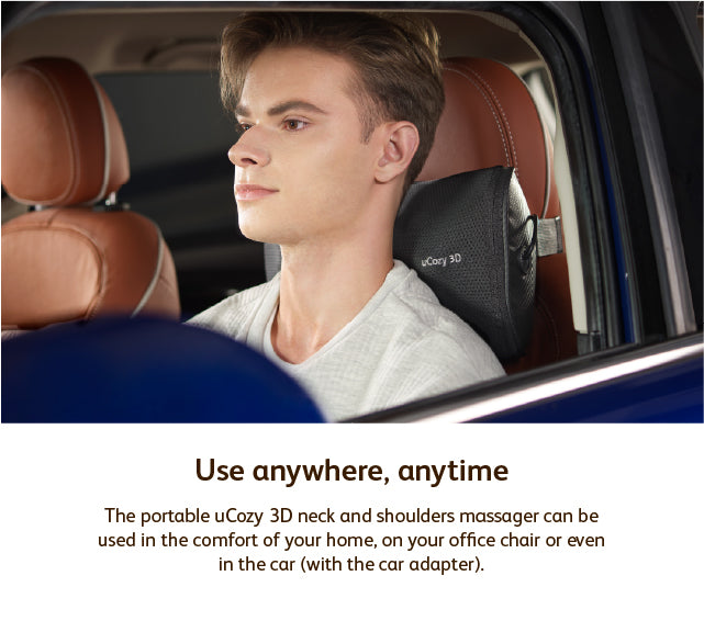 Targeted 3D kneading massage With ergonomically designed 3D massage nodes and firm dual-directional kneading action, the uCozy 3D provides deep tissue relief for body aches. To further enhance your massage experience, the angled design of the uCozy 3D cradles your neck for a snug, intense and targeted massage. Use anywhere, anytime The portable uCozy 3D neck and shoulders massager can be used in the comfort of your home, on your office chair or even in the car (with the car adapter).